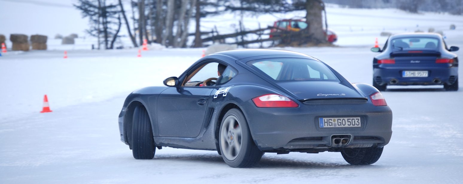 Also wieder zurück zum Katschberg, in die Kälte, auf die präparierte Eisfläche, die ab November keinen Sonnenstrahl mehr sieht und eine riesige Spaßfläche darstellt. Besonders performant ist man mit einem Cayman oder Boxster nicht, aber man lernt sein Fahrzeug sehr gut kennen und zu beherrschen. Es wurde der Begriff geprägt, dass man damit so schnell ist, dass man noch in Öl gemalt werden kann…